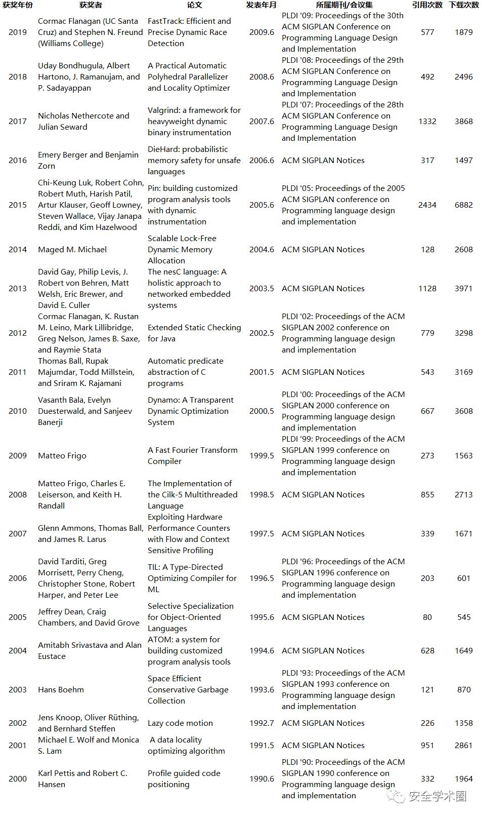 PLDI最有影响力论文奖项是依据论文10年内的影响力进行评选的,因此获奖论文发表时间早于获奖时间10年。下面我们来盘点一下近20年(2000年-2019年)的PLDI最有影响力论文。